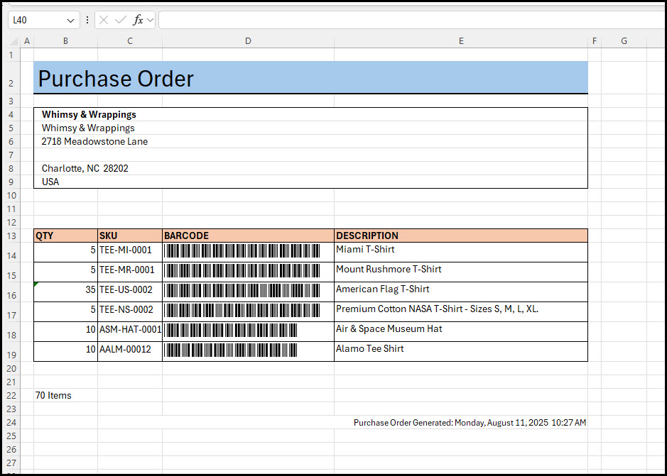 Click the Generate PO button to create the purchase order file. Produces the purchase order that can be used for the vendor/supplier in a formatted Excel spredsheet file. Formats can be custom configured for each vendor if necessary.