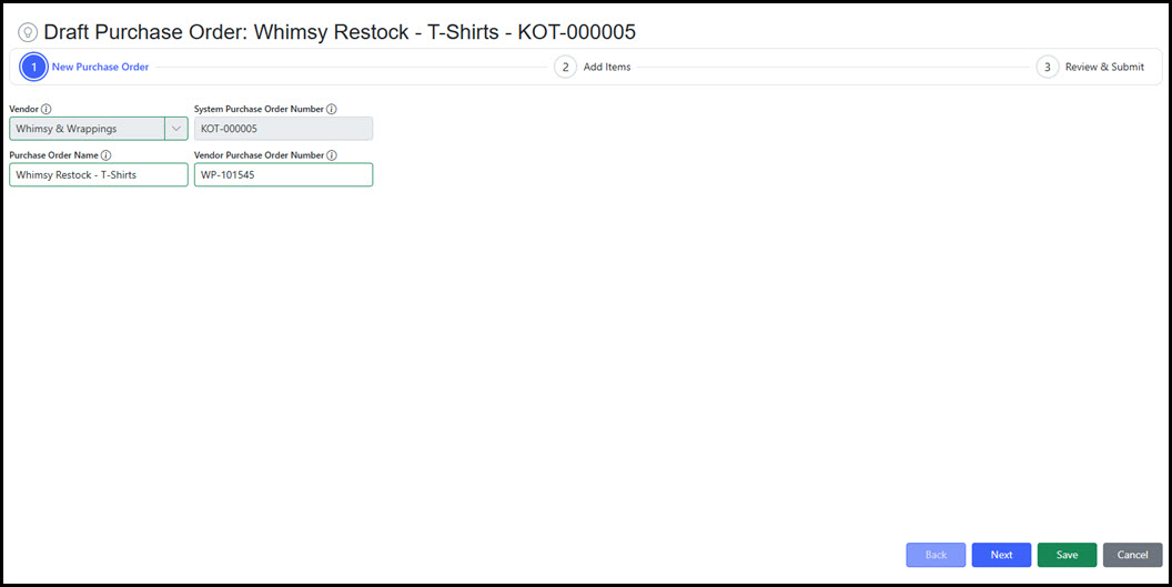 On Step 1, the following fields define the Draft Purchase Order: