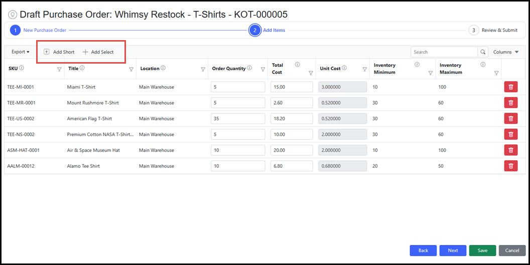 Similar to Add Select, Add Short defaults to only those items for the vendor that are equal to or below the Inventory Minimum amount for the SKU.