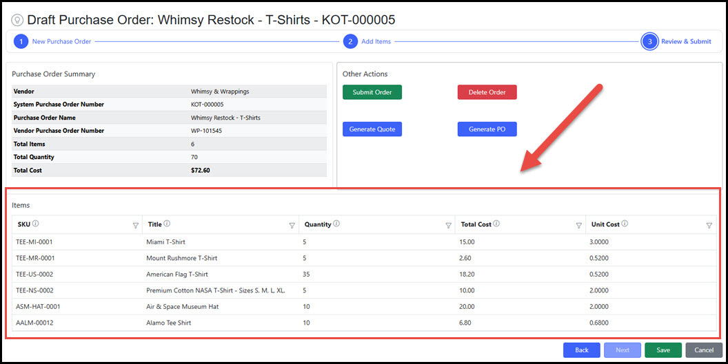 The Items Grid is a detailed display of the individual SKUs in the purchase order including the quantity, total cost, and current unit cost.