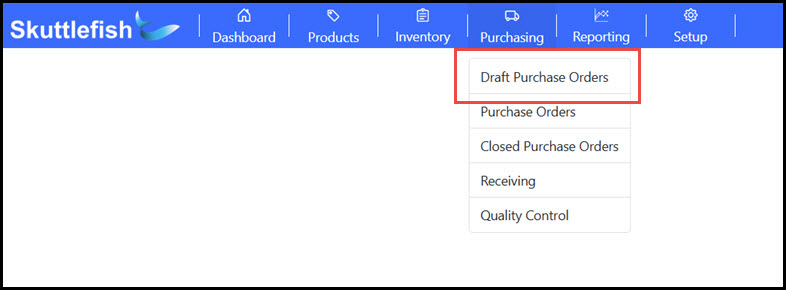 The Draft Purchase Orders view allows the initiation of purchase orders for the replenishment of items from vendors set up within Skuttlefish. The wizard walks through the creation of a new purchase order until it is marked for submission to the vendor.