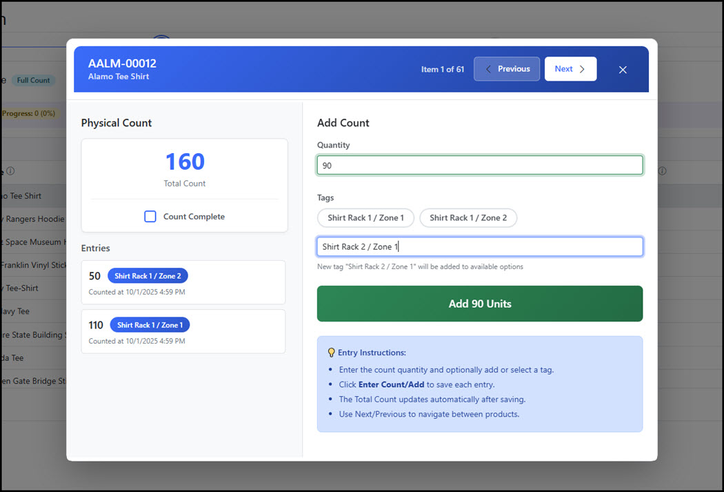 Enter physical counts manually for each SKU using the Add Count Popup, accessed by clicking the Edit button for any SKU. You can add multiple counts per SKU, and each entry can include a custom Tag for identification purposes. All entries are tracked and displayed in the Entries section. Once you've finished counting a SKU, click the Count Complete flag to mark it as "Complete".
