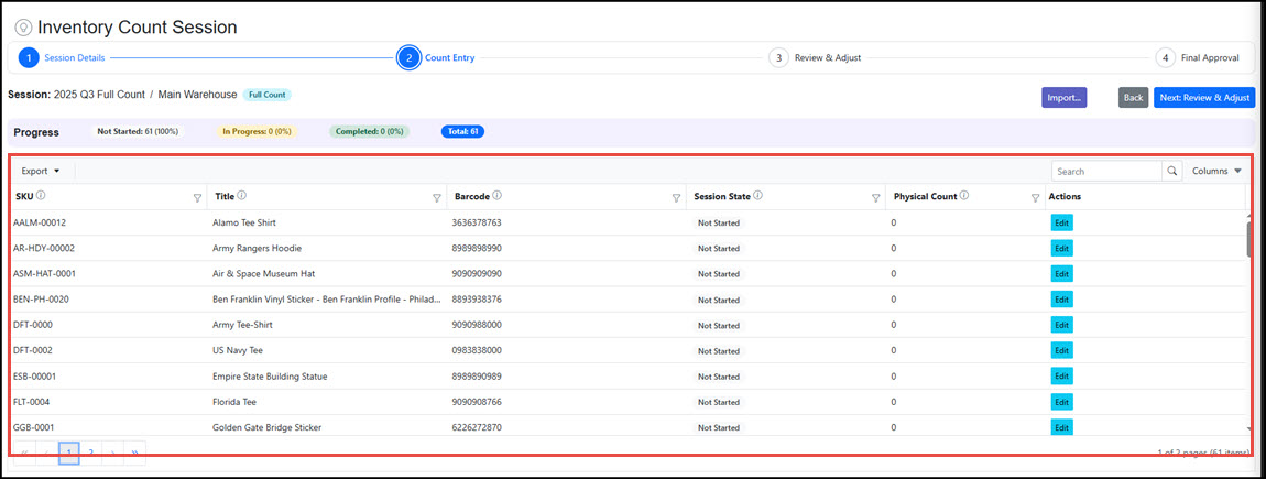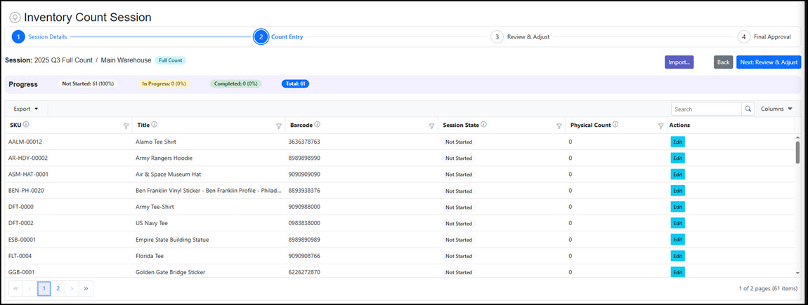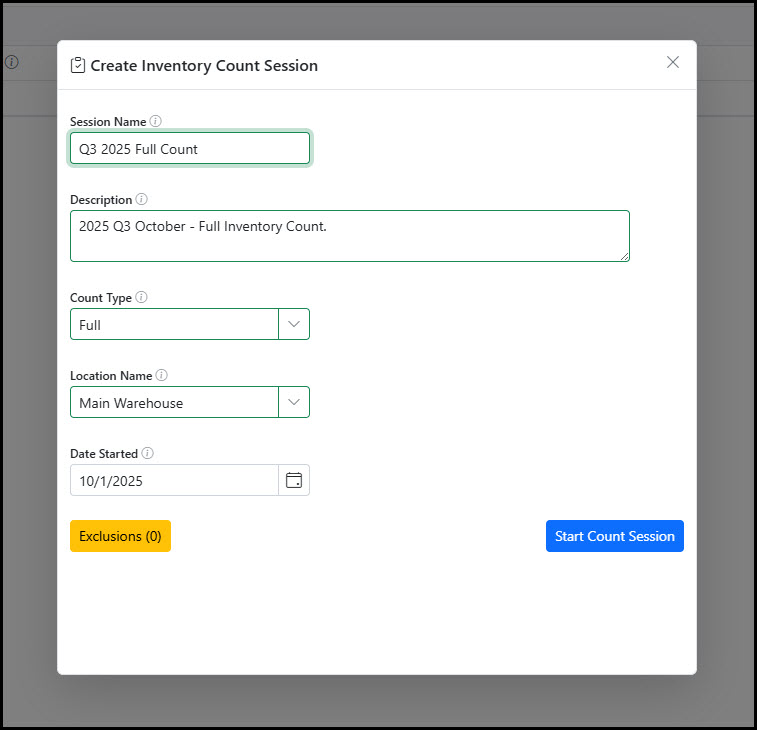 Note: Count Type is currently used for descriptive purposes only and does not affect how the system processes the count. After entering the session details, click Start Count Session to begin the inventory count. ![]() |
