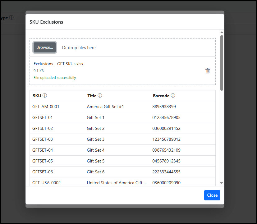 The Exclusions feature allows you to optionally remove specific SKUs from your inventory count session. To exclude items, click the Exclusions button on the Step 1 dialog before initiating the session. Import the standard layout Excel spreadsheet containing the SKUs you want to omit from the count. Any SKUs included in the Exclusions import will not appear in the required count list during the session, streamlining your counting process by focusing only on the items you need to verify.
