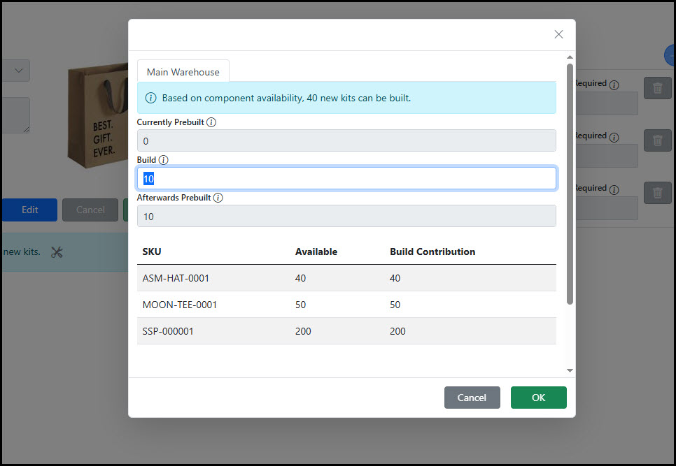 In the Prebuilt Kit popup, add the number of Kits that were constructed. Prebuilding does not increase the total number of kits available beyond what the Component SKU inventory allows. It simply shifts the inventory from the Component SKUs to the Kit SKU.