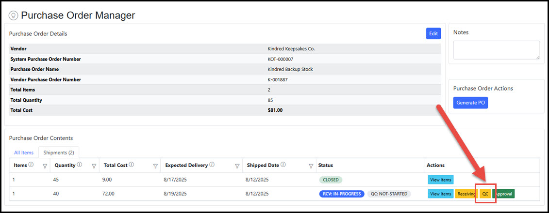 The Purchase Order Manager also shows a QC button on every shipment record; when the Shipment Receiving has initiated processing of the delivered items, it links straight to the Shipment Receiving record.