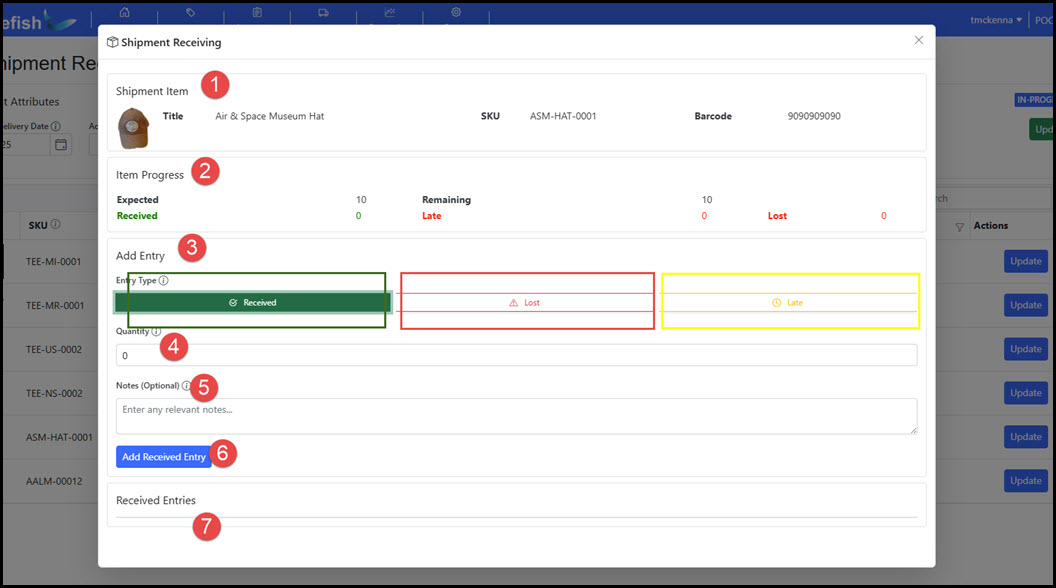 In the Receiving Entry popup, the user can enter product counts as received, late, or lost for the selected item in the current shipment. Below is a labeled view of the Receiving Entry screen and a brief description of each: