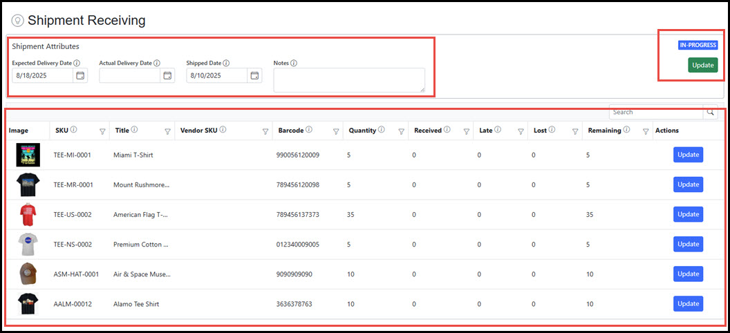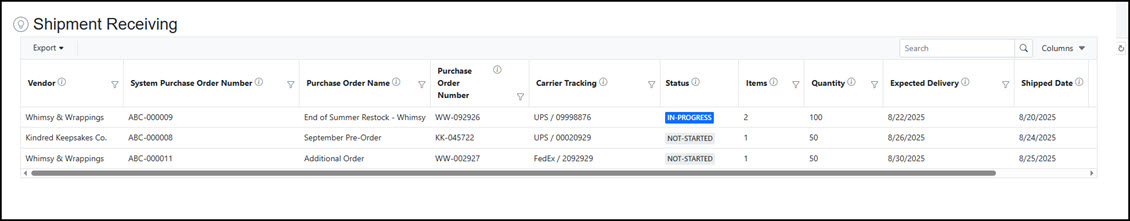 - Receiving: In-Progress – Once an item is manually entered into the Shipment Receiving process, the status of the shipment moves to "In-Progress". The shipment remains in the "In-Progress" status until all items have progressed through the receiving, quality control, and approval process and the shipment is closed.