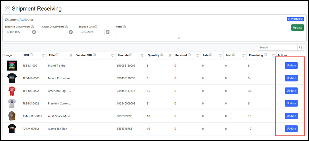 To log the items received in a shipment, click the Update button for the item to access the Receiving Entry screen.